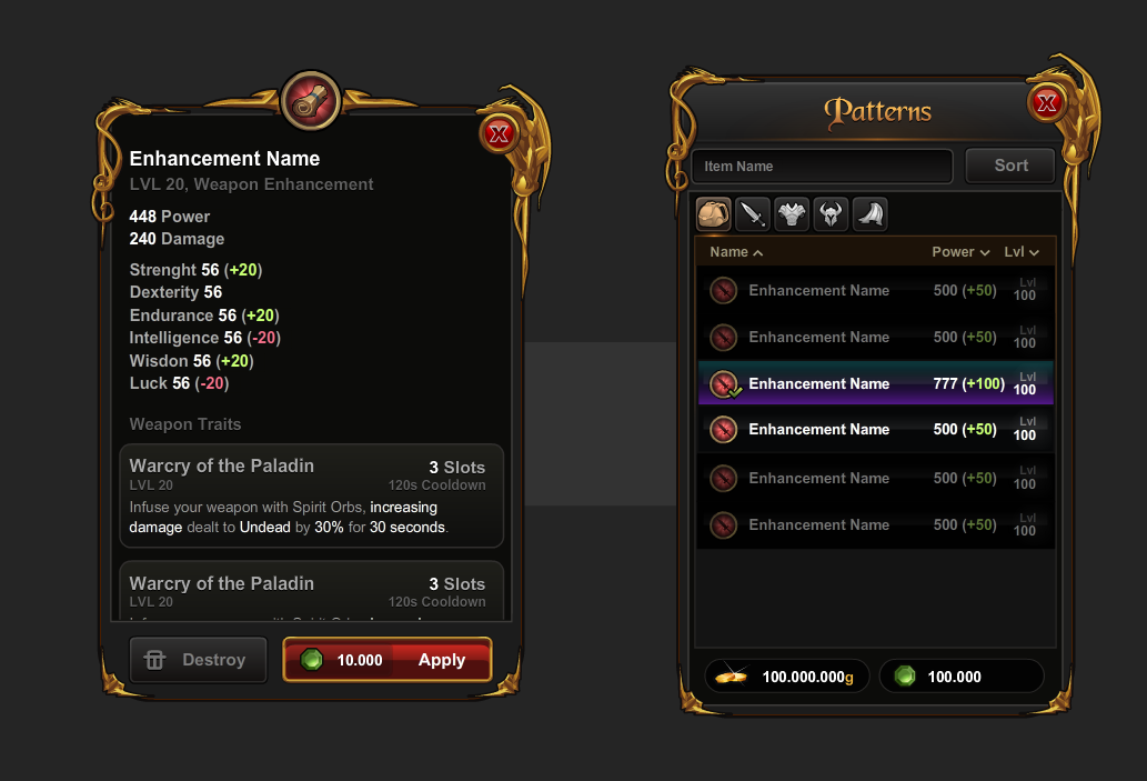 In AQWorlds we have Enhancements and we needed something different to avoid confusion. After going through hundreds of names from Power Core, Battle Gem, to Rune we ultimately decided on Enchantment since it was immersive and lore friendly.
