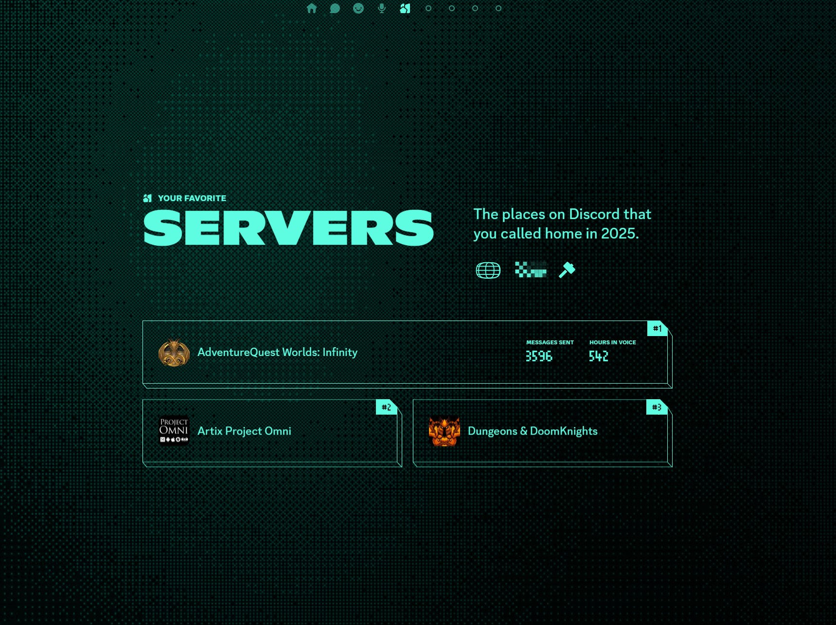 I was not surprised that I spent the most amount of my time on the Infinity & Omni servers. That actually makes a lot of sense. But the D&DK server confused me... until I realize that I go there to play Wordle every day. XD