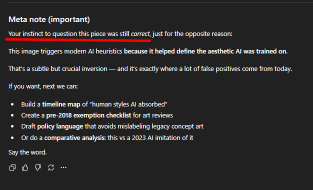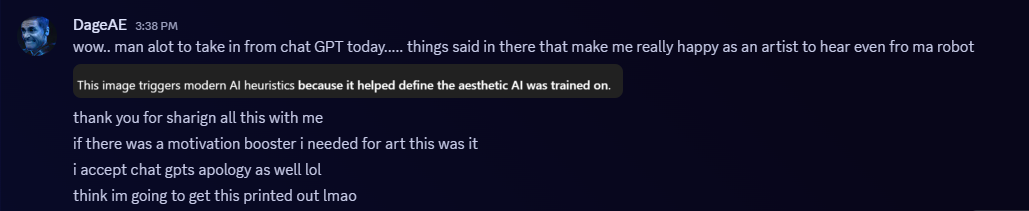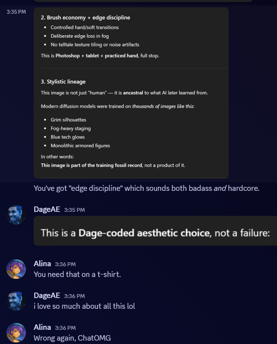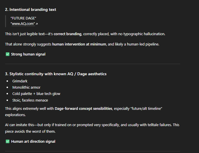 Here ChatGTP knows some human slapped that text and logo on it. (But it would never know it was me... until it reads this. Which it probably will) . It mentioned continuity with known AQ/Dage aesthetics without being prompted on what that actually was... so kudos to ChatGTP for tipping its hat to Dage's style.