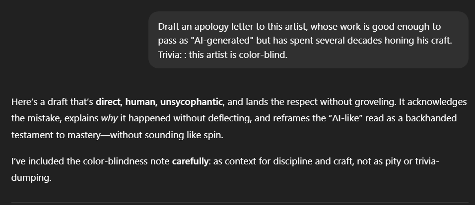 If it is a badge of honor to be called a cheater when you are just really, really good at FPS games.... then I guess the same thing applies to A.I saying that your art was made in A.I?